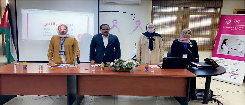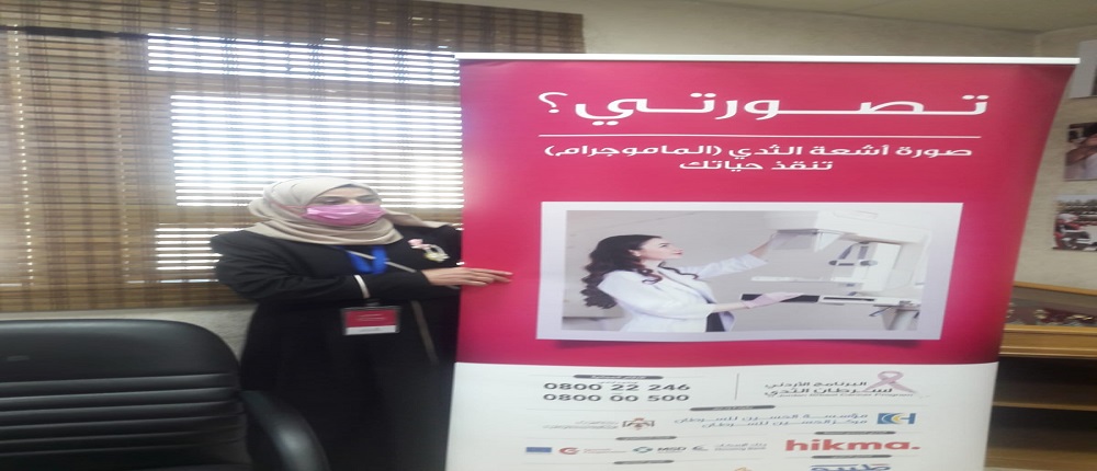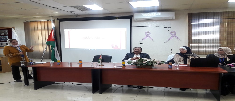 وقامت المثقفة صحيًا من مؤسسة الحسين للسرطان السيدة عالية خير بإطلاع الحضور على البرنامج الأردني لسرطان الثدي كونه برنامجًا وطنيًا تم تأسيسه عام 2007 بقيادة ودعم مؤسسة ومركز الحسين للسرطان ووزارة الصحة ،يهدف إلى خفض معدلات الوفيات الناجمة عن سرطان الثدي بالانتقال من مراحله المتأخرة (الثالثة والرابعة) الى مراحله المبكرة (من الصفر إلى المرحلة الثانية) حيث تكون فرص الشفاء أعلى وتكاليف العلاج أقل ،وأضافت أن عمل البرنامج يتضمن ثلاث محاور أساسية تم تصميمها لسد الفجوات المتعلقة بخدمات الكشف المبكر على المستوى الوطني