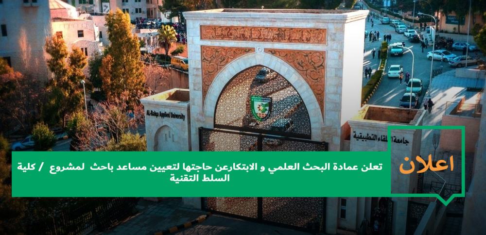 تعلن عمادة البحث العلمي و الابتكارعن حاجتها لتعيين مساعد باحث  لمشروع  / كلية السلط التقنية    و الموسوم بـ