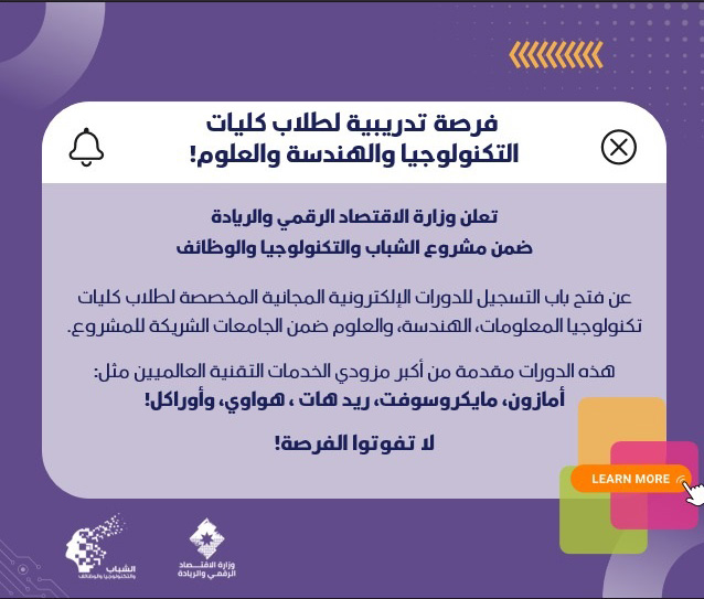 تعلن وزارة الاقتصاد الرقمي والريادة ضمن مشروع الشباب والتكنولوجيا والوظائف بالتعاون مع مركز الحاسوب في جامعة البلقاء التطبيقية عن فتح باب التسجيل لمجموعة من الدورات الإلكترونية المجانية المقدمة من مزودي خدمة التدريب مثل أمازون ومايكروسوفت وريد هات وهواوي وأوراكل والمخصصة لطلبة كليات تكنولوجيا المعلومات، الهندسة، والعلوم في الجامعات الشريكة،