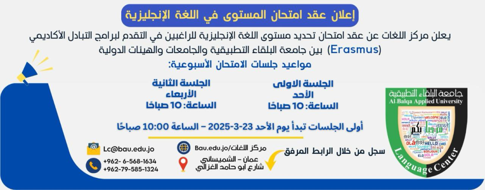 يعلن مركز اللغات – جامعة البلقاء التطبيقية عن عقد امتحان تحديد مستوى اللغة الإنجليزية للراغبين في التقدم لبرامج التبادل الأكاديمي (Erasmus) بين جامعة البلقاء التطبيقية والجامعات والهيئات الدولية.