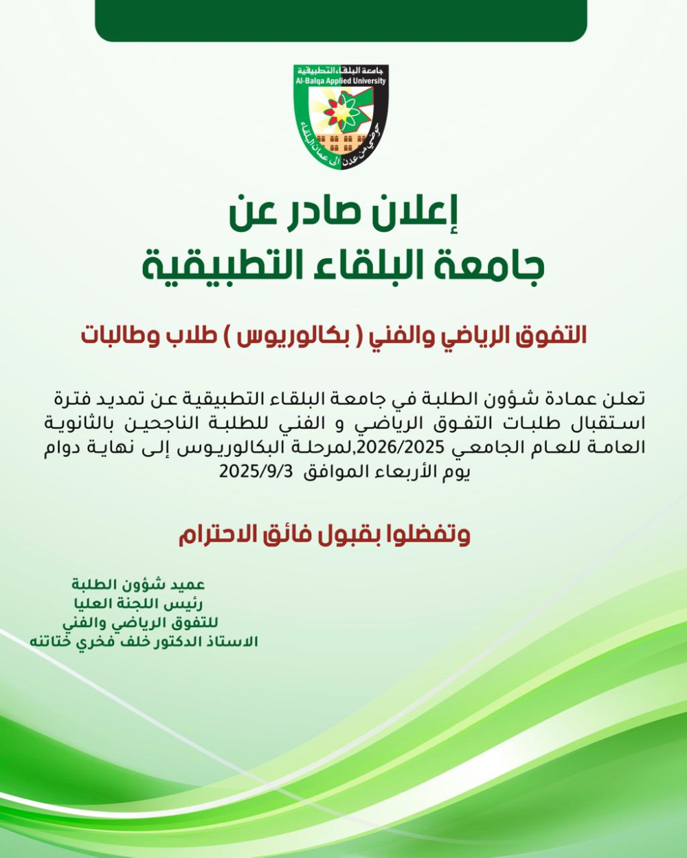 تعلن عمادة شؤون الطلبة في جامعة البلقاء التطبيقية عن تمديد فترة استقبال طلبات التفوق الرياضي و الفني للطلبة الناجحين بالثانوية العامة للعام الجامعي 2025/2026,لمرحلة البكالوريوس إلى نهاية دوام يوم الأربعاء الموافق  3/9/2025 .