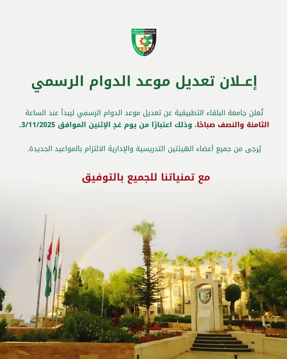 إعلان تعديل موعد الدوام الرسمي في جامعة البلقاء التطبيقية