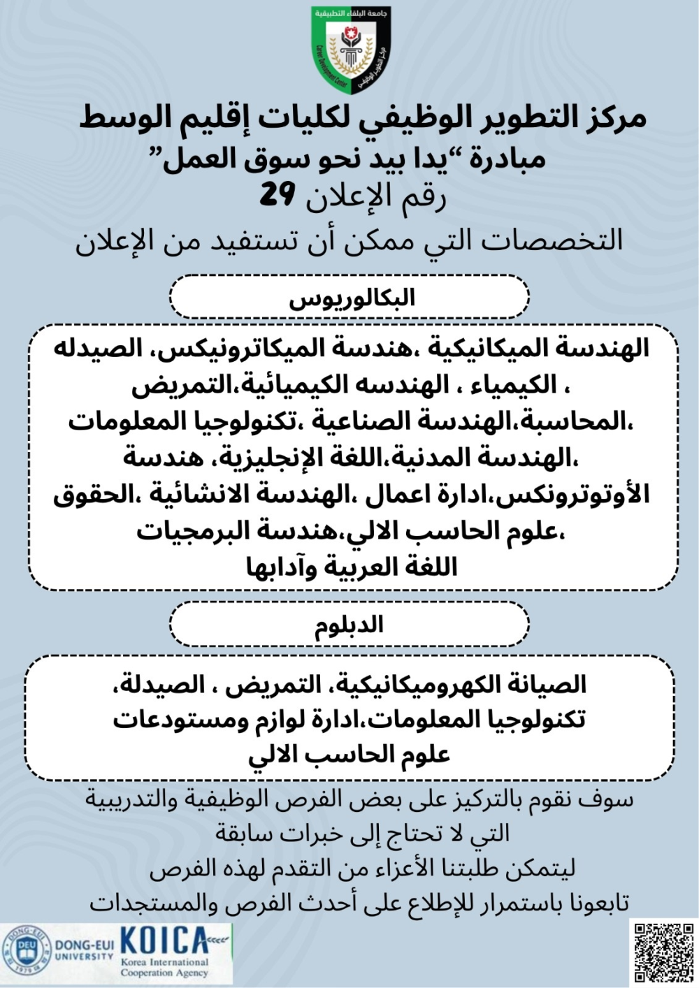 مركز التطوير الوظيفي لكليات إقليم الوسط يطلق الدفعة التاسعة والعشرون من فرص العمل لطلبة وخريجي جامعة البلقاء التطبيقية ضمن مبادرة (يدًا بيد نحو سوق العمل) بواسطة دائرة الإعلام